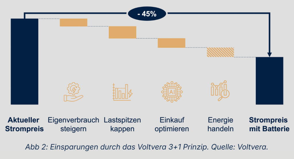 Unternehmen ohne Flexibilitätsoptionen können davon oft nur begrenzt profitieren, da ihre Produktion und ihr Strombezug zeitlich festgelegt sind. Ein Batteriespeicher entkoppelt hingegen Verbrauch und Einkauf. Strom wird in
